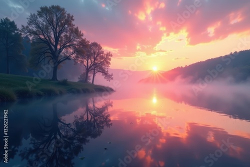 © Sethee, Obraz premium Misty dawn, gentle ripples disturb mirrored sky colors, outdoor, nature
