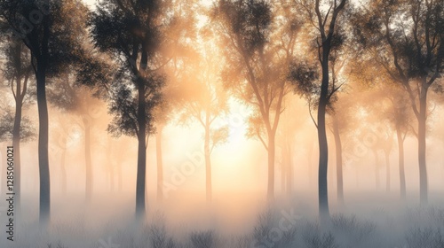 © Sittichai, Fototapeta premium Misty Dawn in the Forest A Serene Sunrise Landscape