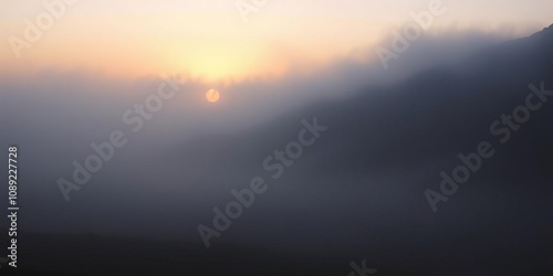 Fototapeta premium Misty dawn landscape with a beam of light shining through the fog, serene backdrop, soft light, atmospheric effect