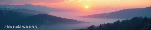 Fototapeta premium Misty dawn landscape with rolling hills and foggy valleys, landscape, soft, mist