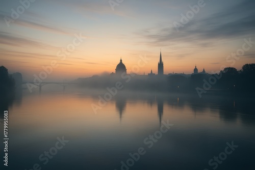 © Jelena, Fototapeta premium Misty dawn over the Thames with iconic London skyline and calm river reflections