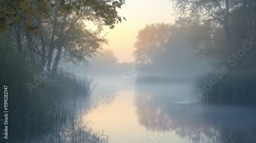 Fototapeta premium Misty Dawn Reflections on a Calm River, Trees and Reeds Silhouetted in the Fog