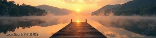 Obraz premium Misty dawn, still lake reflects golden light on wooden dock , dock, mist