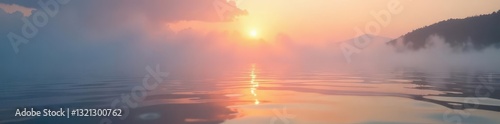 © Katherina, Fototapeta premium Misty dawn, subtle sea ripples reflecting soft light, coastal, sea ripple
