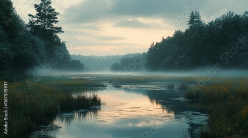 Fototapeta premium Misty dawn, tranquil river, forested banks, yellow blooms.