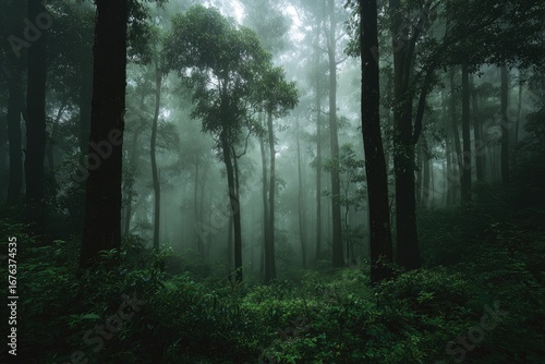 © Rimuru, Fototapeta premium Misty, dense forest. Lush vegetation shrouded in fog