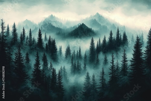 © Donna, Fototapeta premium Misty dense forest with tall pine trees covering rolling mountain peaks under a cloudy sky, evoking a mysterious and tranquil atmosphere