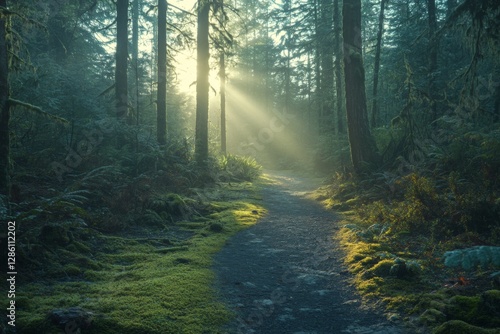 Obraz premium Misty enchanted forest with sun rays filtering through dense trees
