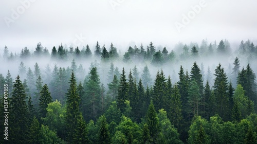 © slamet, Obraz premium Misty Evergreen Forest: A Serene Panorama