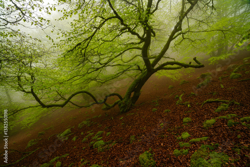 © quickshooting, Naklejka premium Misty fairy forest scene with trees and moss