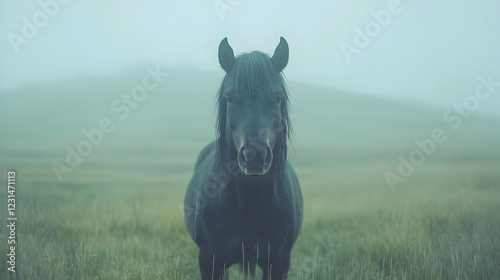 © BROPRADANA, Fototapeta premium Misty field, lone black horse, serene landscape, peaceful nature