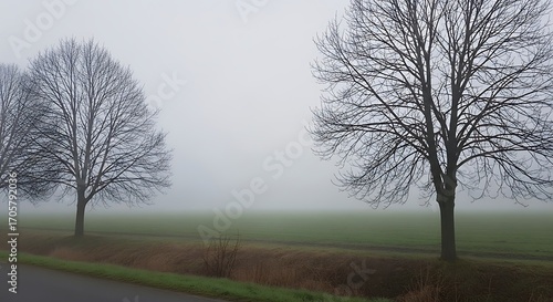 © Retno, Fototapeta premium Misty Field with Two Bare Trees in Winter.