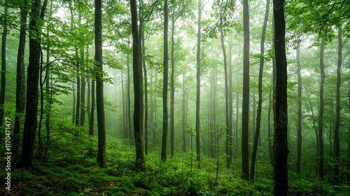 Obraz premium Misty Forest at Dawn Shrouded in Complete Silence with Lush Green Foliage