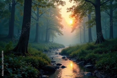 Naklejka premium Misty forest at dusk with a winding creek in the foreground, foliage, peaceful, trees