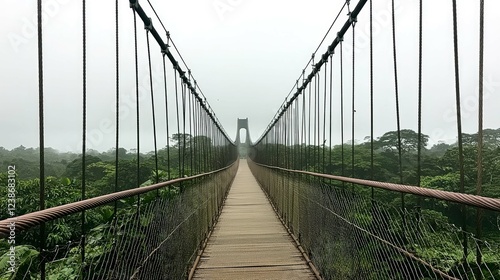 Obraz premium Misty Forest Bridge: A Serene Suspension Bridge Journey Through Lush Greenery. Explore the Tranquil Path, a Peaceful Escape into Untamed Nature.