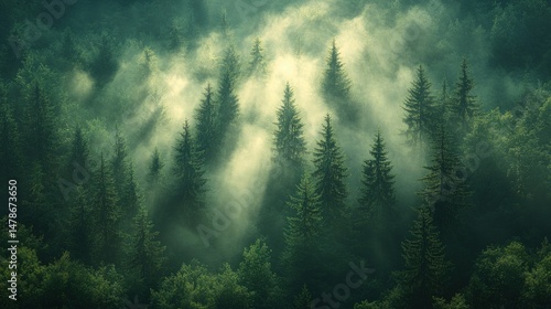 Fototapeta premium Misty forest canopy, sunbeams piercing through