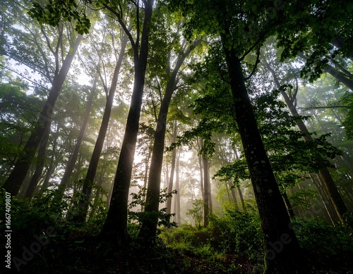 Obraz premium Misty forest canopy. Sunlight streams through