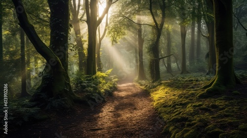 Naklejka premium Misty forest clearing, with dappled sunlight filtering through the trees, and a hidden path leading into the unknown
