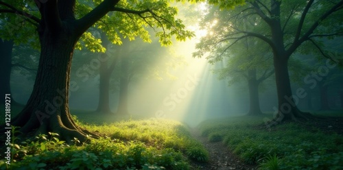 © anu, Obraz premium Misty forest clearing with sunlight filters through, tree, leaf