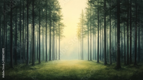 Naklejka premium Misty Forest Clearing with Tall Pine Trees
