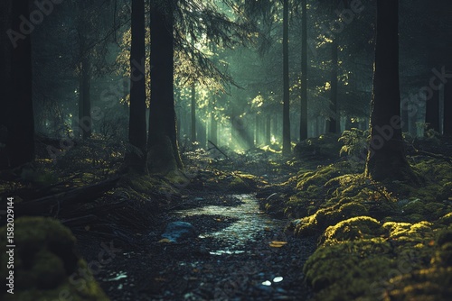 Obraz premium Misty forest creek path. Sunlight beams through dense trees