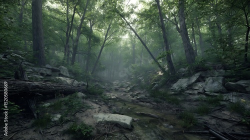 Obraz premium Misty forest creek with fallen log