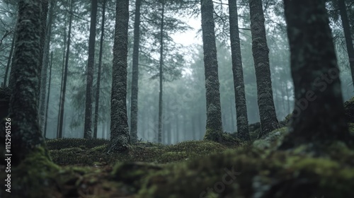 © CreativeBro, Fototapeta premium Misty forest floor perspective showcasing tall trees and the serene sky in a tranquil natural environment