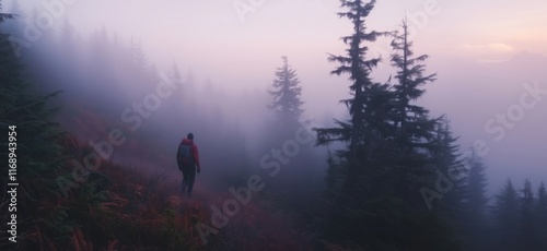 Fototapeta premium Misty forest hike at dawn with lone hiker exploring fog-covered trail...