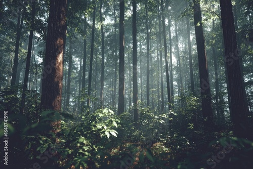 Obraz premium Misty forest interior, sunlight filtering through trees