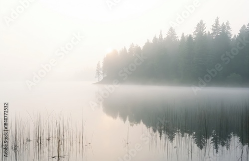 © Pete, Fototapeta premium Misty forest lake with calm water and reeds reflects trees. Foggy atmosphere over water surface at sunrise. Serene nature scene in Sweden creates peaceful mood.