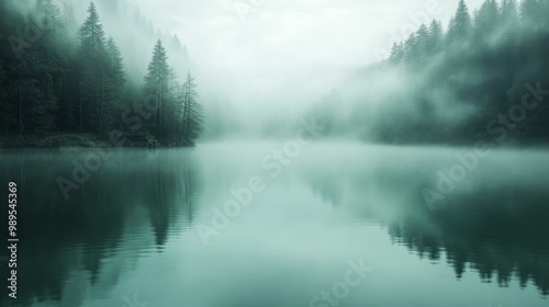 © XtravaganT, Fototapeta premium Misty Forest Lake with Reflections - Tranquil Nature Photography