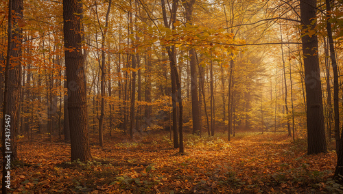 © janzwolinski, Obraz premium Misty Forest Landscape with Golden Hues at Dawn