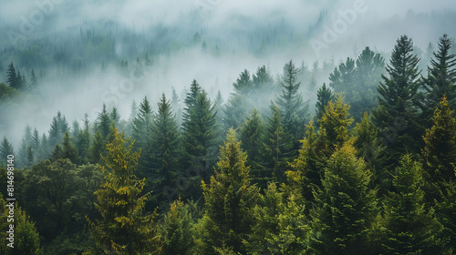 Fototapeta premium Misty forest landscape with lush green trees and fog