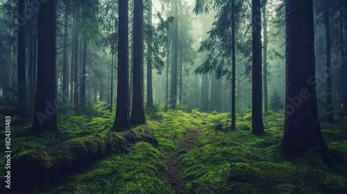 © gen_pick, Obraz premium Misty forest landscape with moss glowing in soft morning light