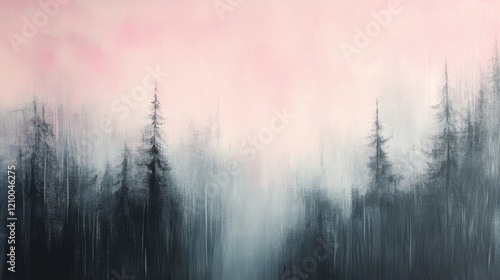 Naklejka premium Misty Forest Landscape with Pink Sky