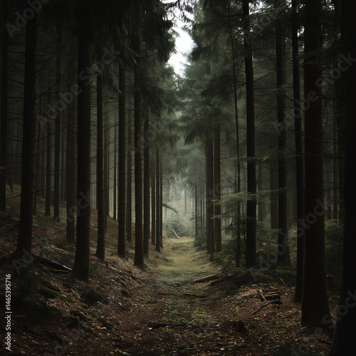 © Mykhaylo, Naklejka premium Misty forest landscape with rays of sunlight through trees, magical and calm morning scene with deep atmospheric light in nature