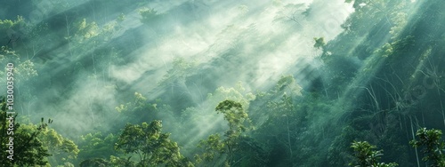 Obraz premium misty forest landscape with sunlight streaming through trees, highlighting...