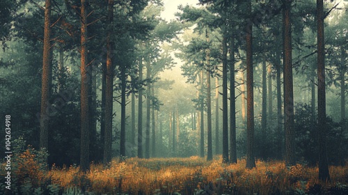Naklejka premium Misty forest landscape with tall pine trees