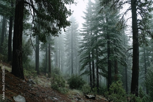 Fototapeta premium Misty forest landscape with tall trees and dense fog creating a serene...