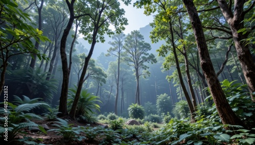 Fototapeta premium Misty Forest Landscape with Tall Trees and Lush Green Foliage Bathed in...