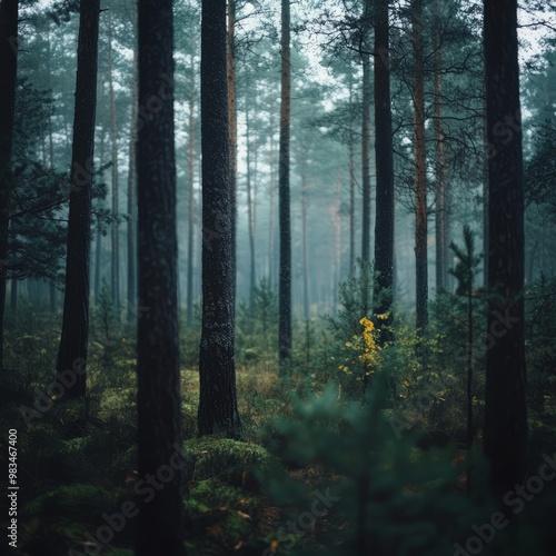 © Damerfie, Fototapeta premium Misty Forest Landscape with Tall Trees and Soft Light