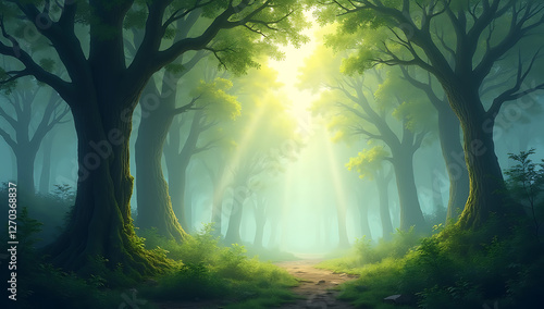 © Prateek, Naklejka premium Misty Forest Morning – A Serene, Foggy Woodland Background with Sunlight Peeking Through Dense Trees