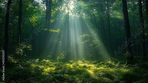 Fototapeta premium Misty forest morning, dense woods enveloped in fog, soft rays of sunlight...