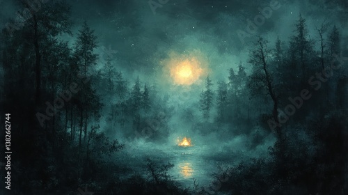 Obraz premium Misty forest night scene with campfire