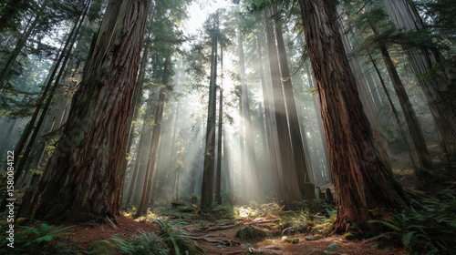 Naklejka premium Misty forest of towering red-barked trees with sunbeams piercing through ancient canopy, conveying primordial serenity.