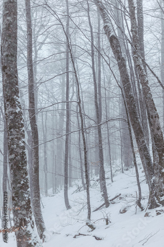 © mssanela, Fototapeta premium misty forest on snowy winter day