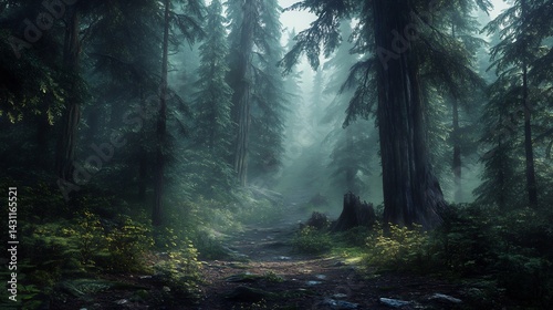 Obraz premium Misty Forest Path: A Serene, Ethereal Landscape