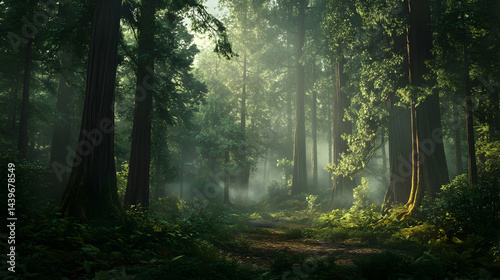 Obraz premium Misty Forest Path: A Serene Landscape Photography