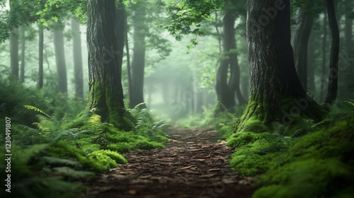 Obraz premium Misty Forest Path: A Serene, Mossy Trail Through Ethereal Woods