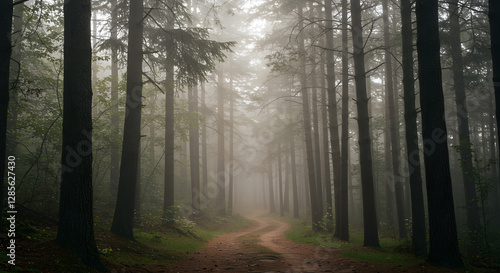 © ziehefzie, Obraz premium Misty Forest Path: A Serene Walk Through Tall Trees on a Foggy Morning